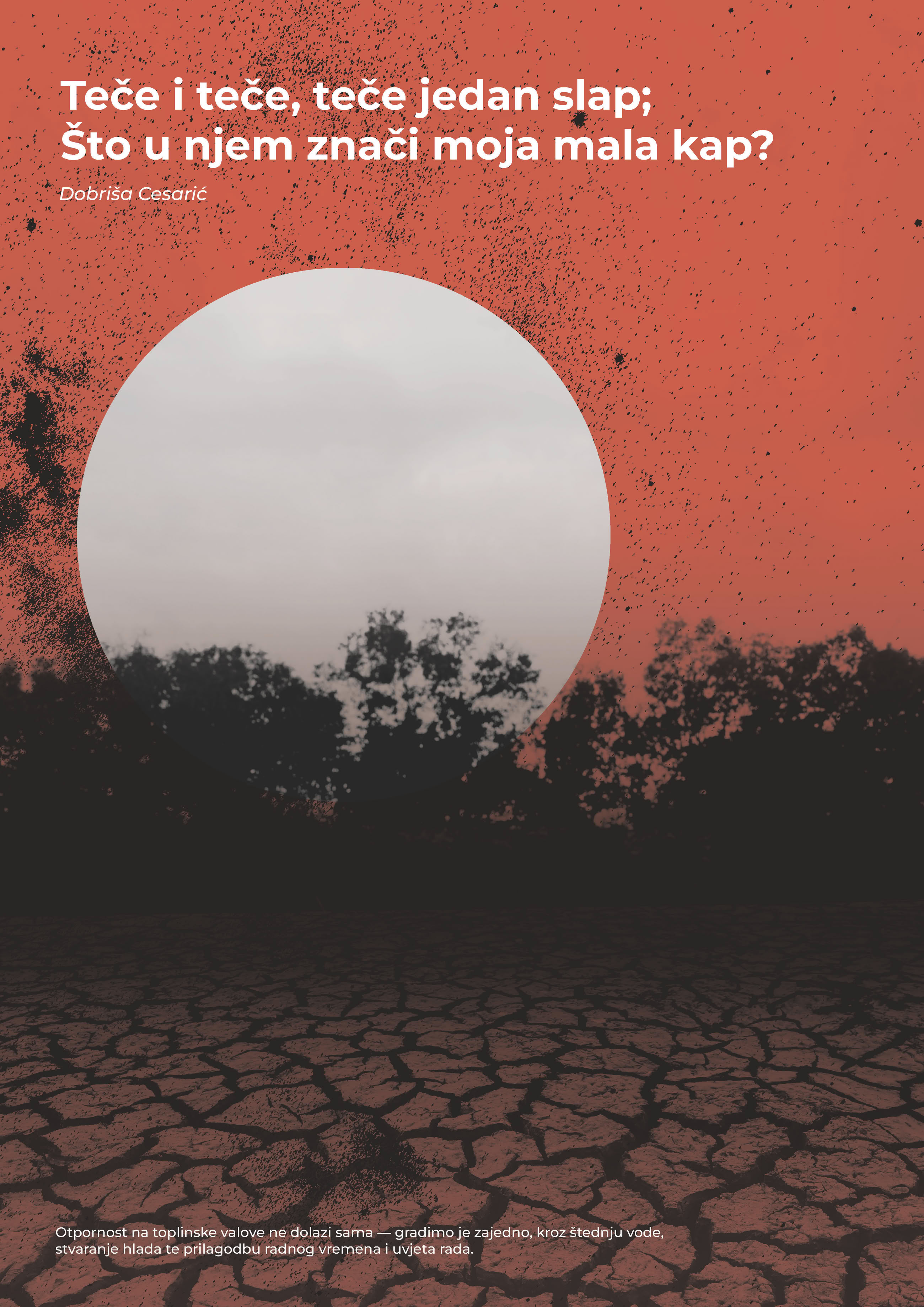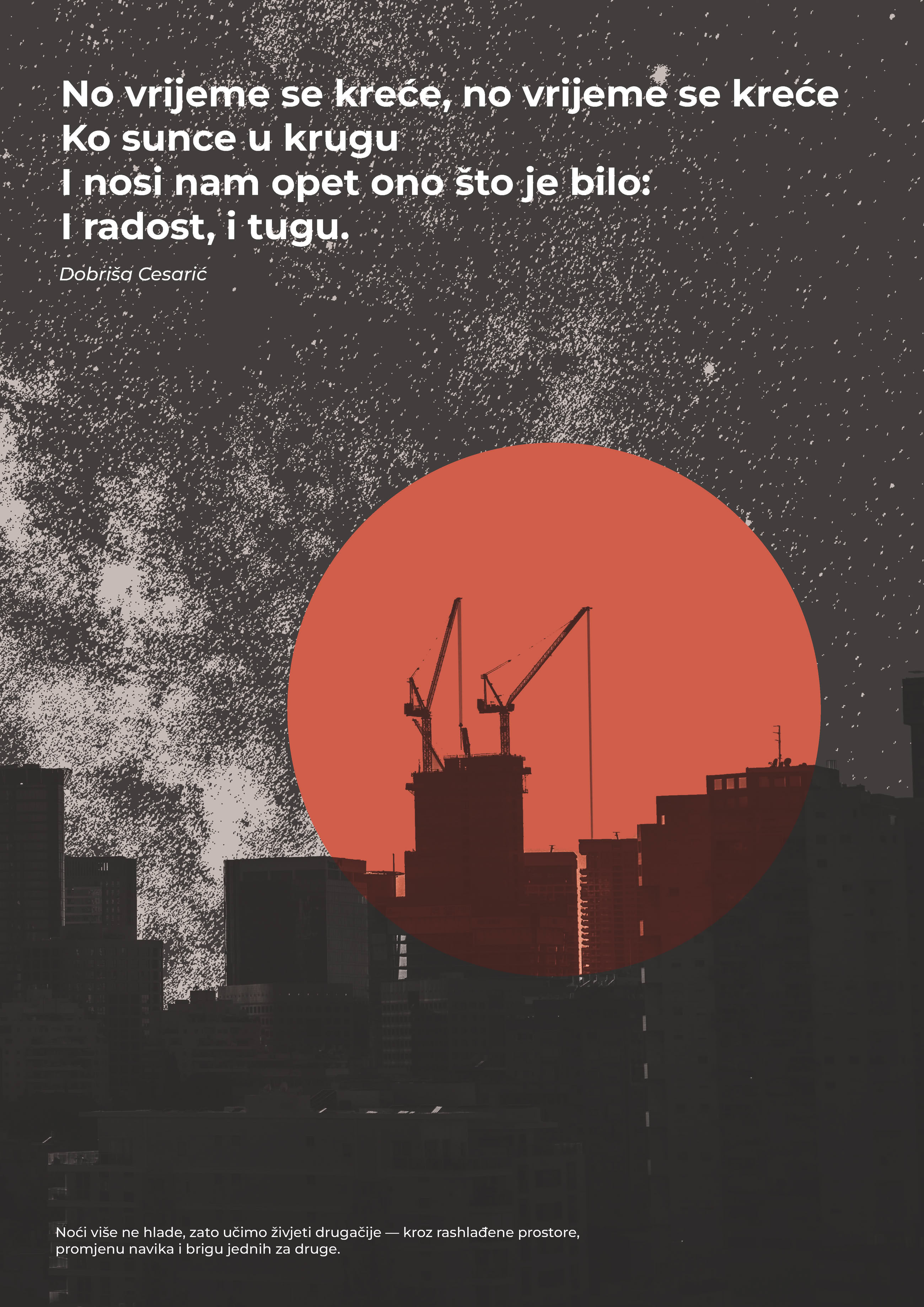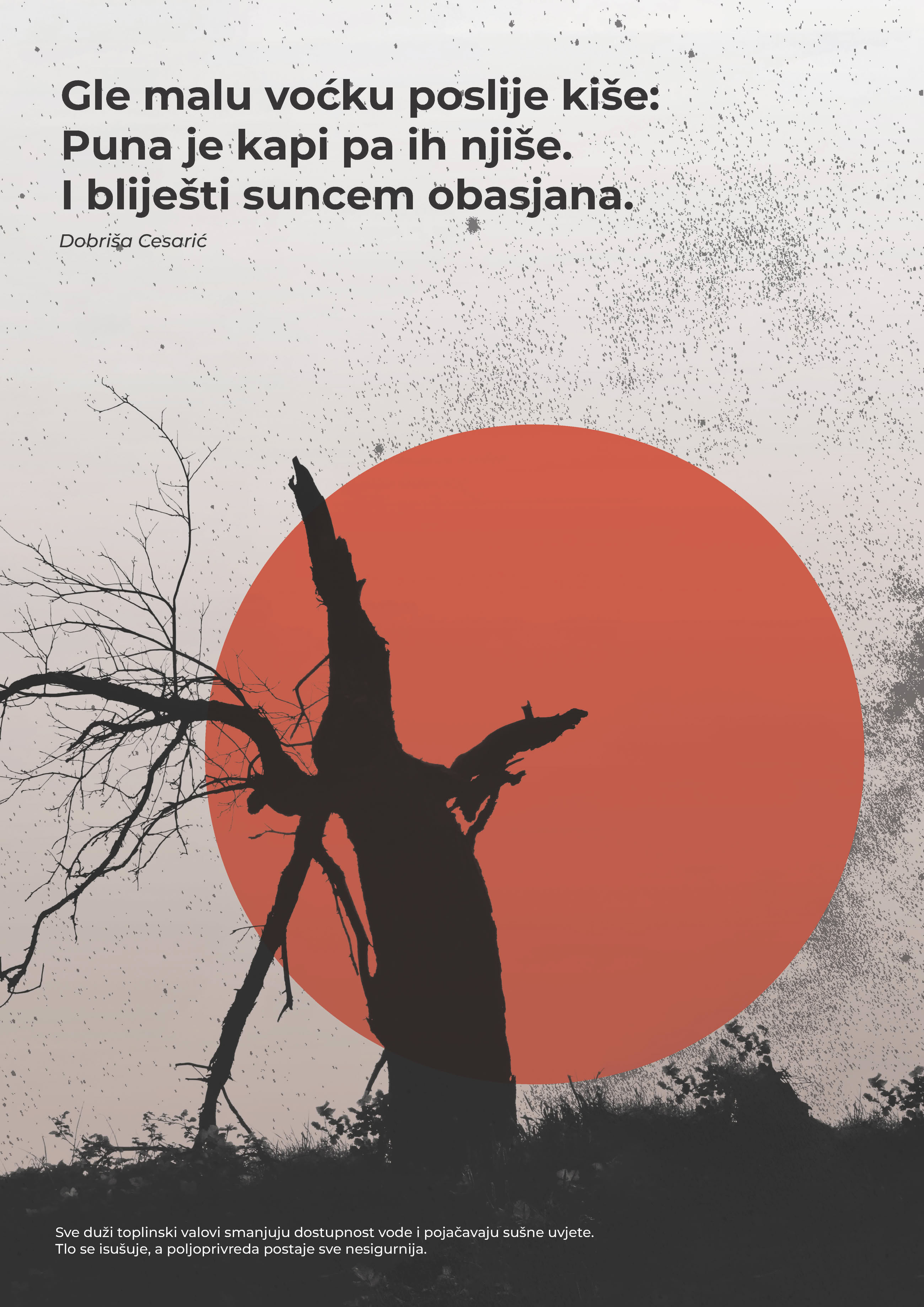 Koncept rada tematizira problem toplinskih valova kroz neočekivan pristup — uporabom svima poznatih stihova Dobriše Cesarića. Njihova prisutnost priziva iskustvo prvog susreta s poezijom, najčešće vezano uz školsko razdoblje, potičući promatrača da rad sagleda iz perspektive gotovo dječjeg pogleda. Tako se stvara osjećaj poznatog i bliskog, ali i kontrast u odnosu na ozbiljnost prikazane teme.